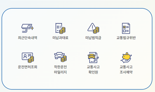 첫 번째로 '과태료' 메뉴에서는 교통 위반에 따른 과태료 정보를 확인하고 납부할 수 있습니다. 두 번째 '법칙금' 메뉴에서는 교통법규 위반에 대한 범칙금 정보를 조회하고 처리할 수 있죠. 세 번째 '교통법규위반' 메뉴에서는 자신의 교통법규 위반 내역을 확인할 수 있습니다. 마지막으로 '운전면허' 메뉴에서는 운전면허 관련 정보를 조회하고 각종 신청을 할 수 있습니다.